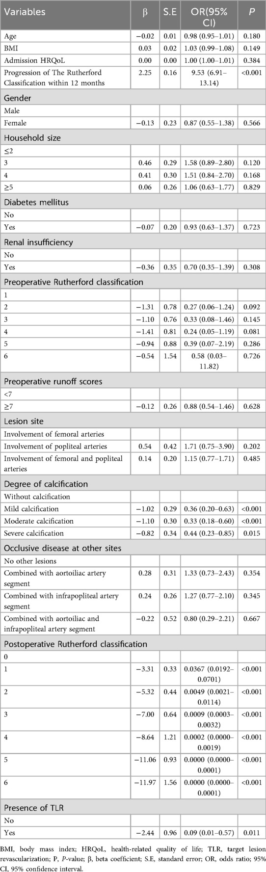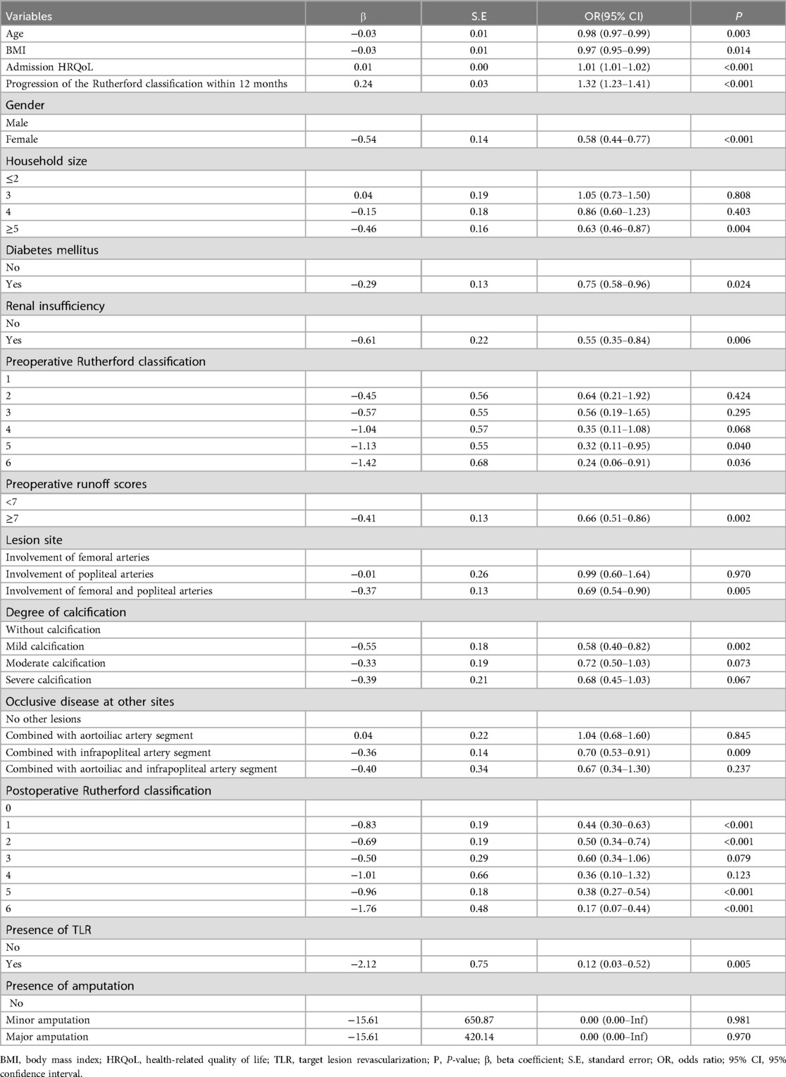 In the analysis of variables in treatment information and postoperative follow-up, patients with several postoperative Rutherford classification grades (grades 1, 2, 5 and 6) demonstrated a significantly lower OR for HRQoL scores, ranging from 0.17 to 0.44 (P < 0.001). Moreover, the OR for HRQoL scores increased by 27% for each additional level of improvement in the Rutherford classification, indicating that patients exhibiting a greater degree of improvement in the Rutherford classification tend to experience an enhanced HRQoL (95% CI: 1.19–1.36, P < 0.001). Furthermore, the OR for patients who underwent TLR was only 0.12 (95% CI: 0.03–0.52, P = 0.005), signifying that TLR events were associated with a markedly diminished HRQoL scores. In contrast, the multivariable model showed that statistical significance was not achieved by the presence of amputation (p > 0.1).