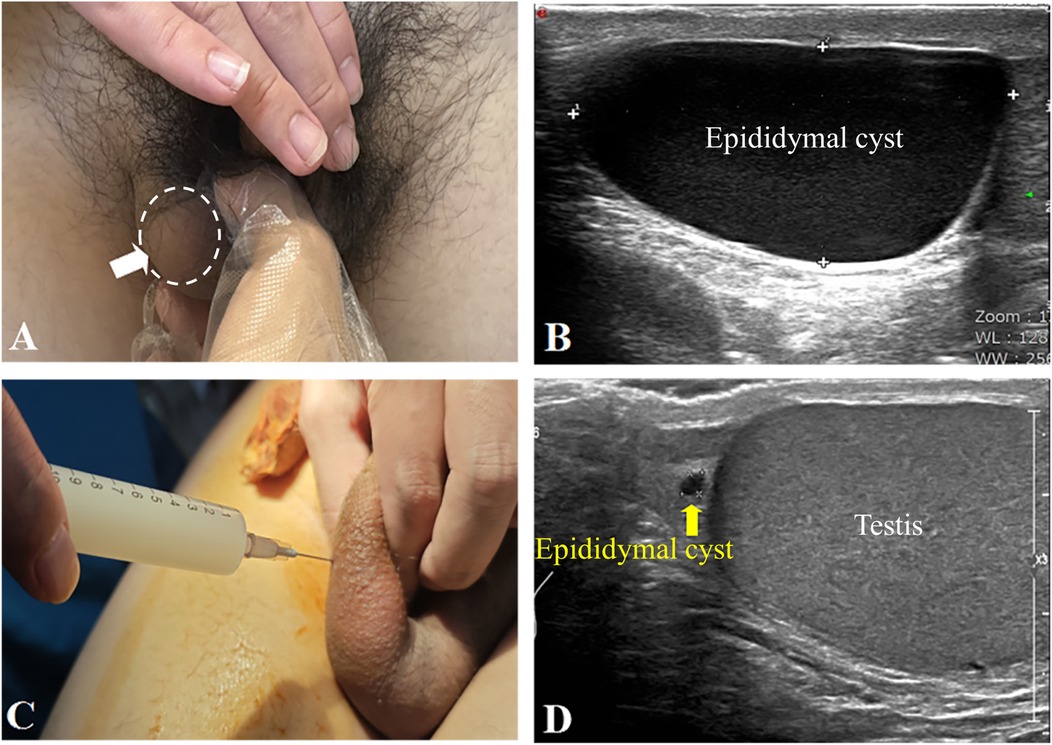 A 15-year-old adolescent, previously healthy, presented to our hospital for evaluation and management of phimosis due to a small foreskin opening that had persisted for one year. On physical examination, both testicles were in normal position. The foreskin opening was noted to be narrow and non-retractable. A cystic mass, approximately 3 × 4 cm in size, smooth, non-adherent, and non-tender, was palpated in the right scrotum (Figure 1A). The transillumination test was positive, while no abnormalities were detected in the left scrotum. Scrotal ultrasound examination revealed “prominent enlargement of the head of the right epididymis with a well-defined anechoic area measuring 40 × 22 × 34 mm, poor internal acoustic transmission, and posterior acoustic enhancement” (Figure 1B), suggestive of Epididymal cyst. After explaining the condition to the family, surgical excision of the this cyst was recommended. The family, however, declined surgical excision due to concerns over invasiveness and potential long-term impacts on testicular function. Following a shared decision-making process where all options—including observation, aspiration (with its high recurrence risk), sclerotherapy (with its uncertain risk of epididymal damage), and surgical excision—were discussed, we opted for diagnostic cyst aspiration during the planned circumcision to obtain fluid for analysis. All procedures were performed in an outpatient operating room with the patient in the supine position. After routine disinfection of the penis and scrotum with 0.5% povidone-iodine, the planned puncture site over the right scrotal cyst was anesthetized by local infiltration with 1% lidocaine. Approximately 20 mL of milky, opaque fluid was successfully aspirated using a disposable 10 mL syringe (Figure 1C). Following this, the surgical field was re-disinfected, and a circumcision was performed. The procedure was well-tolerated with stable vital signs and no reported pain. The patient was monitored in the recovery room for 30 min with no immediate complications (e.g., bleeding, hematoma) noted. Given that the appearance of the aspirated fluid is pivotal for differentiating a spermatocele from an infectious collection, the sample was sent for laboratory analysis, including semen analysis and microbiological culture, to establish a definitive diagnosis. Semen analysis revealed a high concentration of sperm. Bacterial culture results for Neisseria gonorrhoeae were negative. Based on the patient's medical history, physical examination, and auxiliary examinations, the final diagnosis was a spermatocele. Four months post-procedure, the child returned for follow-up. He reported no symptoms related to the right scrotum. Physical examination showed no significant differences between the two testes, and no obvious mass was palpable in the right scrotum. Follow-up scrotal ultrasound confirmed a significant reduction in the size of the right epididymal head cyst to 3 × 2 × 2 mm (Figure 1D).