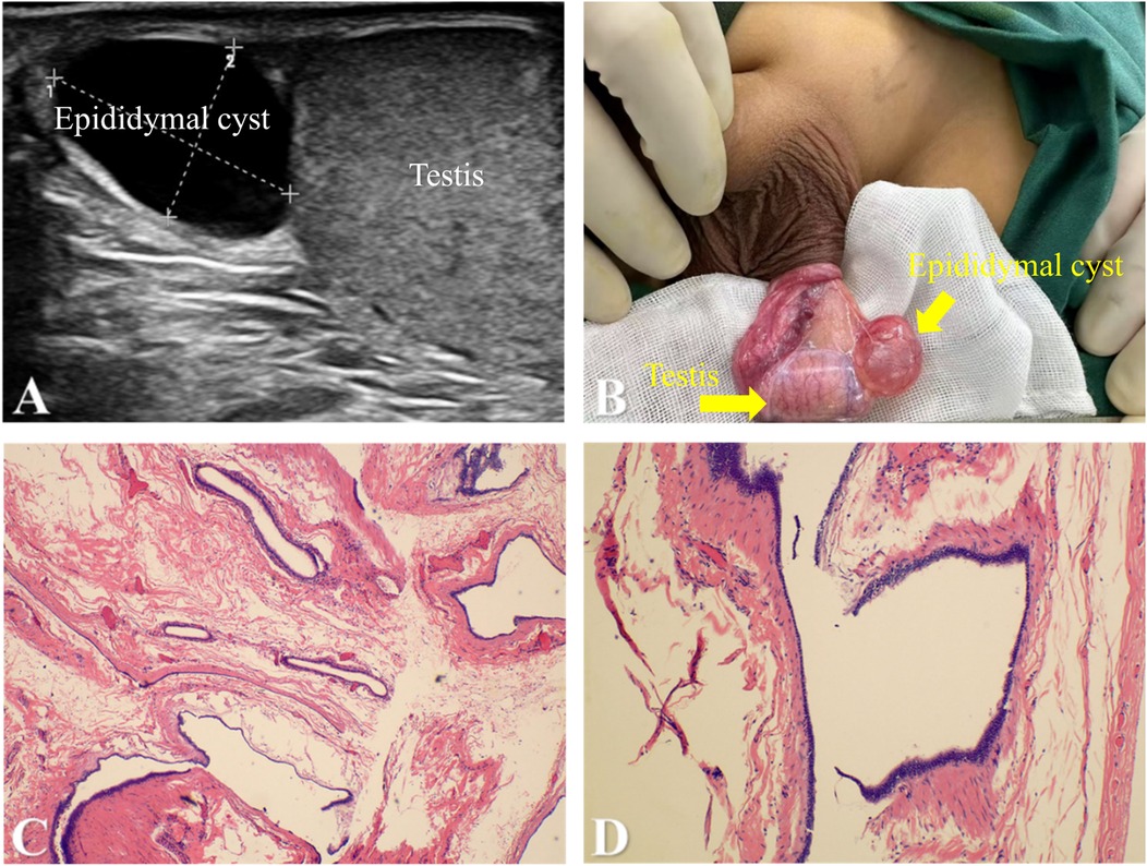 Figure 2. (A) scrotal ultrasound revealed a hypoechoic fluid-filled area above the left testis within the scrotum, measuring approximately 17 × 12 × 17 mm. The mass(epididymal cyst) had clear boundaries and exhibited good sound transmission. (B) Intraoperative findings revealed a mass superior to the testis, which was identified as enlarged epididymal tissue measuring approximately 20 × 17 × 15 mm. (C) and (D) Microscopic examination revealed cystic wall tissue lined by a single layer of cuboidal to flattened epithelium with focal ciliation. The cyst wall consisted of fibrous connective tissue with scattered bundles of smooth muscle.