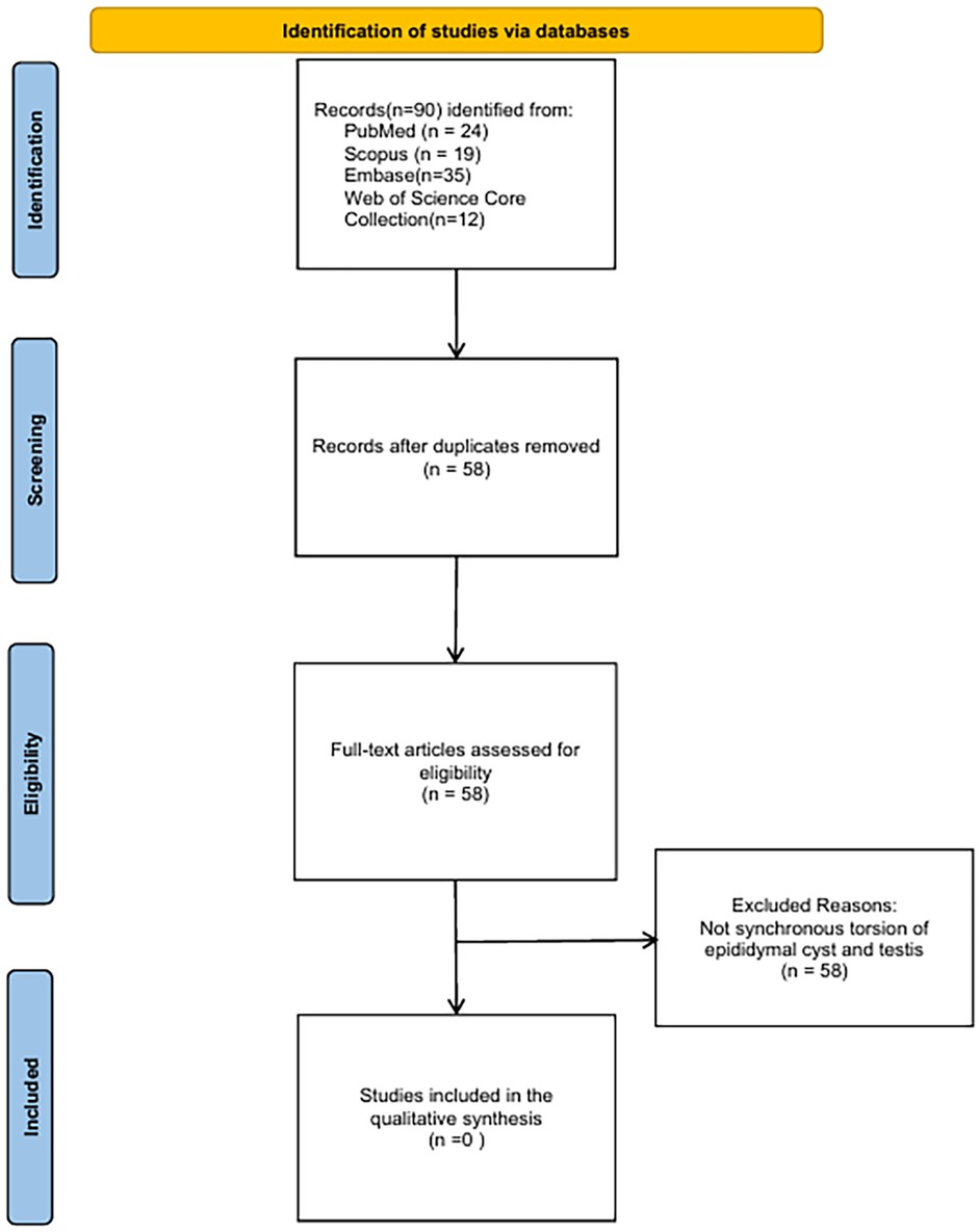 To validate the novelty of our case, we performed a systematic literature review up to May 31, 2025, across PubMed, Scopus, Embase, and Web of Science, using the search string: (“epididymal cyst” OR “spermatocele”) AND (“testicular torsion” OR “spermatic cord torsion”). After screening 58 unique publications following deduplication, none of the articles described the synchronous torsion of an epididymal cyst and ipsilateral testis (see PRISMA flow diagram, Figure 4). Therefore, to our knowledge, our Case 3 represents the first documented instance of this unique clinical scenario, where both the cyst (720°) and testis (180°) underwent synchronous torsion.