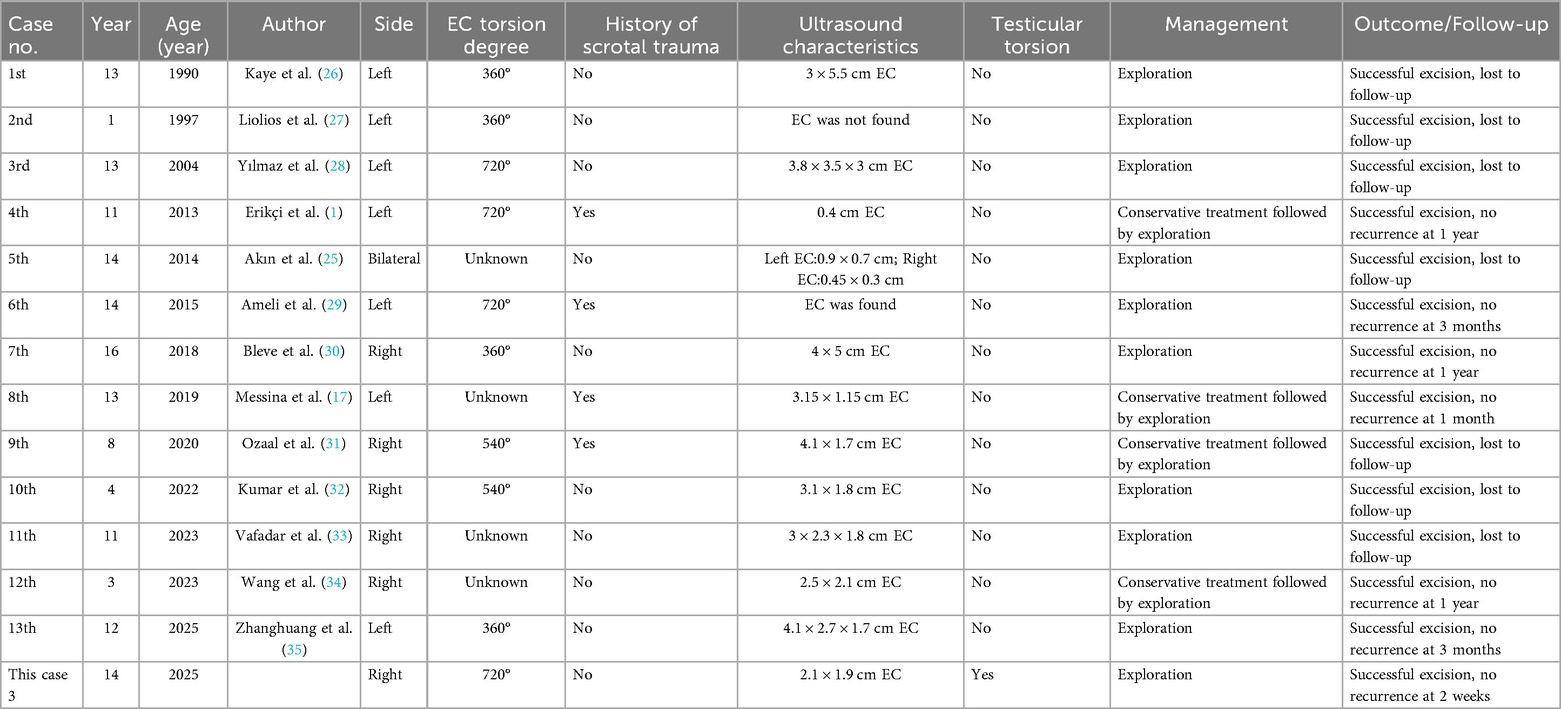 Epididymal cyst torsion, while rare, can lead to acute scrotal pain and redness. The diagnosis of torsion should be differentiated from other conditions, including testicular torsion, appendage torsion, spermatic cord torsion, epididymitis, orchitis, scrotal trauma, and testicular tumors (5). In cases of acute scrotal pain, the most critical differential diagnosis is testicular torsion, particularly within the first 6 h of symptom onset, as early intervention is key to preventing testicular injury (17). Ultrasound findings of epididymal cyst torsion often show a lack of blood flow, whereas conditions like epididymitis typically exhibit increased blood flow (4). Unfortunately, no clinical marker currently exists to definitively distinguish epididymal cyst torsion from other scrotal emergencies, and aggressive exploration may be the only reliable method of diagnosis. It has also been suggested that the presence of an epididymal cyst can alter the anatomical position and axis of the ipsilateral testis, thereby increasing the risk of testicular torsion in affected individuals (5). Among the 14 previously reported cases of epididymal cyst torsion (Table 1), none were associated with concomitant ipsilateral testicular torsion. Notably, our Case 3 represents a unique clinical scenario where both the cyst (720°) and testis (180°) underwent torsion—the first documented case of synchronous torsion involving an epididymal cyst and testis.