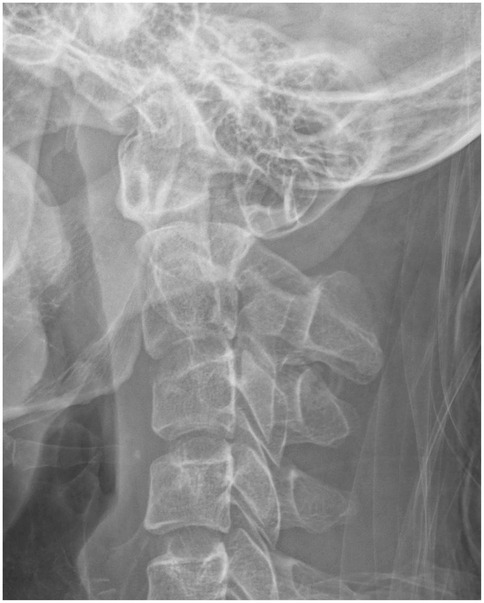 Figure 1. Preoperative lateral cervical radiographs. Preoperative cervical x-ray showed C2 Hangman fracture.