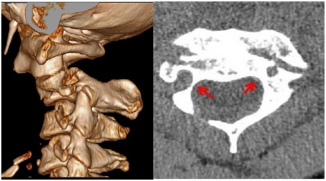 Figure 2. Preoperative cervical spine CT three-dimensional reconstruction and plain scan. The three-dimensional reconstruction showed Hangman fracture, and the axial view showed the high-riding vertebral artery, as a height of the isthmus internal marked by the left red arrow.