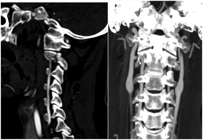 Figure 3. Preoperative cervical angiography CT sagittal and coronal reconstruction. Vertebral arteriography showed that the distance from the top of vertebral artery foramen to the upper articular surface was less than 2 mm, and the left side was the dominant artery.