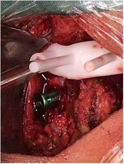 Figure 4. Intraoperative 3D-printed patient-specific templates guided pedicle screw placement. Intraoperative use of 3D printed patient specific templates for C1–2 pedicle screw placement.