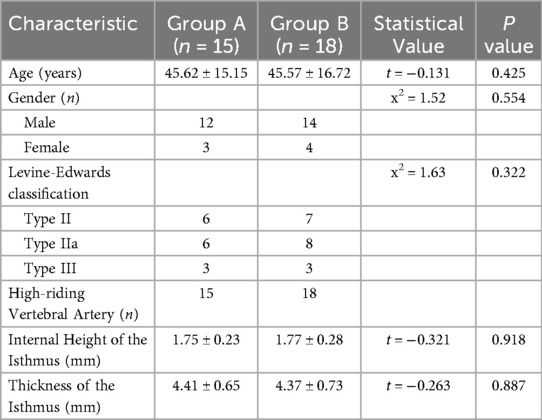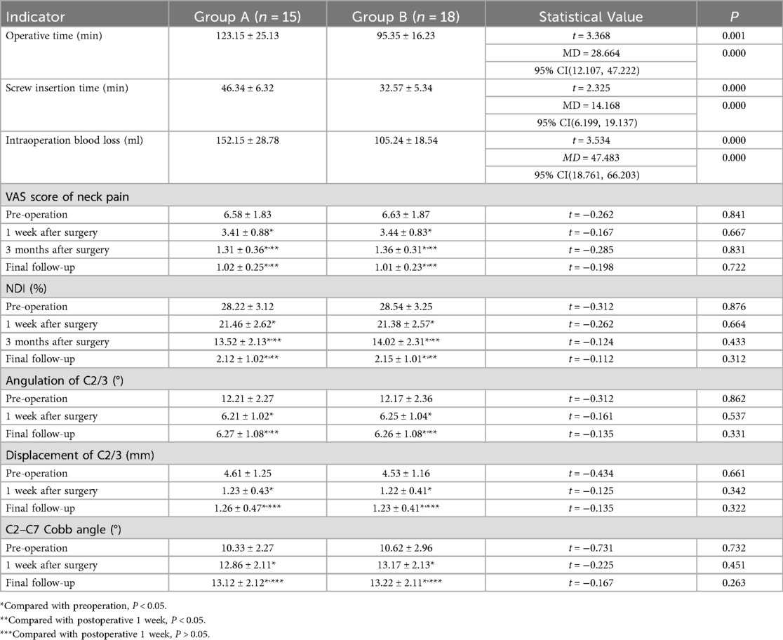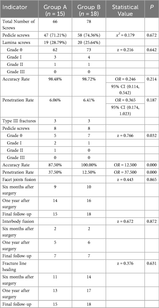 Postoperative follow-up was conducted at 7 days and every 3 months after surgery, and cervical spine anteroposterior and lateral x-ray films and CT were reviewed to observe the internal fixation. The screws placement time and operation time of each group were recorded. Cervical spine CT was reviewed at 7 days after surgery, and the postoperative pedicle screw position was graded according to the Neo grading standard, and the screw placement satisfaction rate and cortical penetration rate were evaluated. The Japanese Orthopaedic Association (JOA) score and cervical dysfunction index (NDI) were used to evaluate the cervical nerve function of patients before and after surgery and at the last follow-up. The occurrence of complications was observed. The calculation method for screws placement time: For Group A, the time was recorded from the completion of exposure, the installation of the dynamic reference clamp, until the last pedicle screw was placed and the screw was confirmed to be safe and satisfactory by intraoperative fluoroscopy. For Group B, the time was recorded from the completion of bony structure exposure, ready to start placing the first pedicle screw, until the last pedicle screw was placed and the screw was confirmed to be safe and satisfactory by intraoperative fluoroscopy. According to the Neo grading standard (11): Grade 0 screws are all located inside the pedicle, without penetrating the cortex of the pedicle; Grade 1, the pedicle screw has penetrated the cortex, but <2 mm; Grade 2, the pedicle screw has penetrated the cortex >2 mm, but <4 mm; Grade 3, the pedicle screw has penetrated the cortex >4 mm. The calculation method for the placement satisfaction rate is: (Grade 0 + Grade 1) screw count/total screw count × 100%. The penetration rate calculation method is: (Grade 1 + Grade 2 + Grade 3) screw count/total screw count × 100%. Imaging observation indicators: Before surgery, 1 week after surgery, and at the last follow-up, the C2/3 angle, C2/3 displacement distance, and cervical lordosis angle were measured. Fracture healing and C2/3 fusion: The fracture and fusion conditions at various time points were observed. (1) Fracture healing criteria: The fracture line is completely closed with callus and bone trabeculae crossing the fracture line on cervical spine lateral x-ray films or cervical spine CT. (2) C2/3 facet joint fusion or intervertebral body fusion is defined as C2/3 fusion, and C2/3 fusion that occurs without bone grafting is called spontaneous fusion (12, 13). The criteria for facet joint fusion are: the disappearance of the facet joint space with continuous bone formation; the criteria for intervertebral body fusion (any of the following three conditions): (1) continuous bone bridge formation at the anterior edge of the vertebra; (2) continuous bone bridge formation at the posterior edge of the vertebra; (3) continuous bone bridge formation at both the anterior and posterior edges of the vertebra.