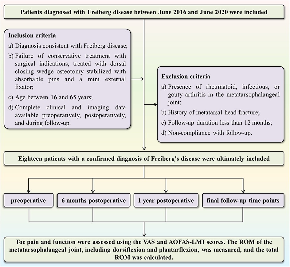 This study was a retrospective analysis that included 18 patients diagnosed with Freiberg disease at our department between June 2016 and June 2020. All patients had necrosis of the second metatarsal head and were treated with DCWO of the metatarsal head, using absorbable pins combined with a mini external fixator for intraoperative stabilization. Participants were screened based on the inclusion and exclusion criteria (Figure 1). Inclusion criteria were as follows: 1) Diagnosis consistent with Freiberg disease according to the combination of clinical symptoms and imaging examinations (10, 23): i. Patient presented with pain, swelling, tender to palpation and limited range of motion over the affected MTP joint; ii. Imaging findings, including flattening and sclerosis of the metatarsal head, joint space narrowing, and the presence of intra-articular loose bodies, were revealed on weight-bearing radiographs (AP, lateral, oblique) or CT scans. In selected atypical cases, MRI was obtained to identify occult lesions; 2) Patients who failed ≥6 months of conservative treatment (oral NSAIDs, activity modification, avoidance of high-impact exercises, joint immobilization, and custom orthotic devices) and met surgical indications underwent DCWO stabilized with bioabsorbable pins and a mini external fixator; 3) Age between 16 and 65 years; 4) For all patients, complete clinical records and imaging assessments—weight-bearing radiographs (anteroposterior, lateral, and oblique views) —were obtained preoperatively, postoperatively, and during follow-up evaluations. Additionally, computed tomography (CT) scans were obtained preoperatively to assess joint morphology. Exclusion criteria were as follows: 1) Presence of rheumatoid, infectious, or gouty arthritis in the metatarsophalangeal joint; 2) History of metatarsal head fracture; 3) Follow-up duration shorter than 12 months; and 4) Non-compliance with follow-up. This study was approved by our Hospital's Medical Ethics Committee (Ethics No: 2021082), it was conducted in accordance with the Declaration of Helsinki and informed consent was waived due to the retrospective nature of this study.
