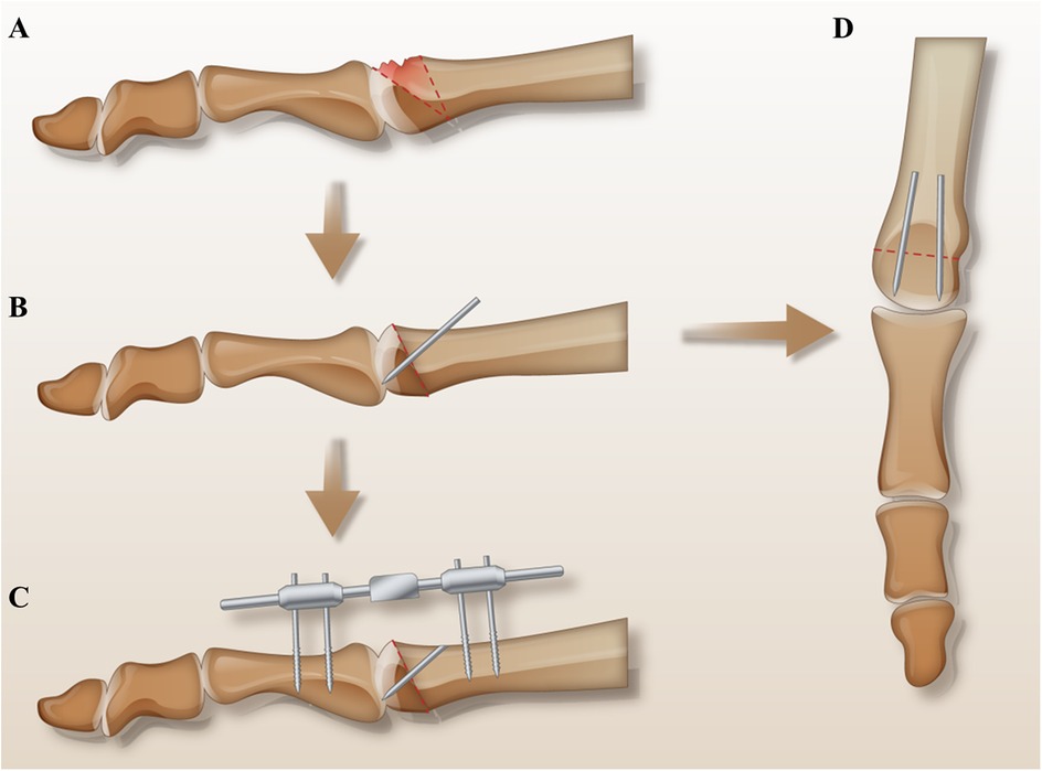 Figure 2. Surgical schematic diagram: (A) shows the necrotic area and the osteotomy line. (B,D) Demonstrate the dorsal closing wedge osteotomy, where the lesion was excised, the osteotomy site was closed, and the intact plantar joint surface was rotated dorsally. Two absorbable pins were inserted along the vertical osteotomy line. (C) Illustrates the installation of the mini external fixator.