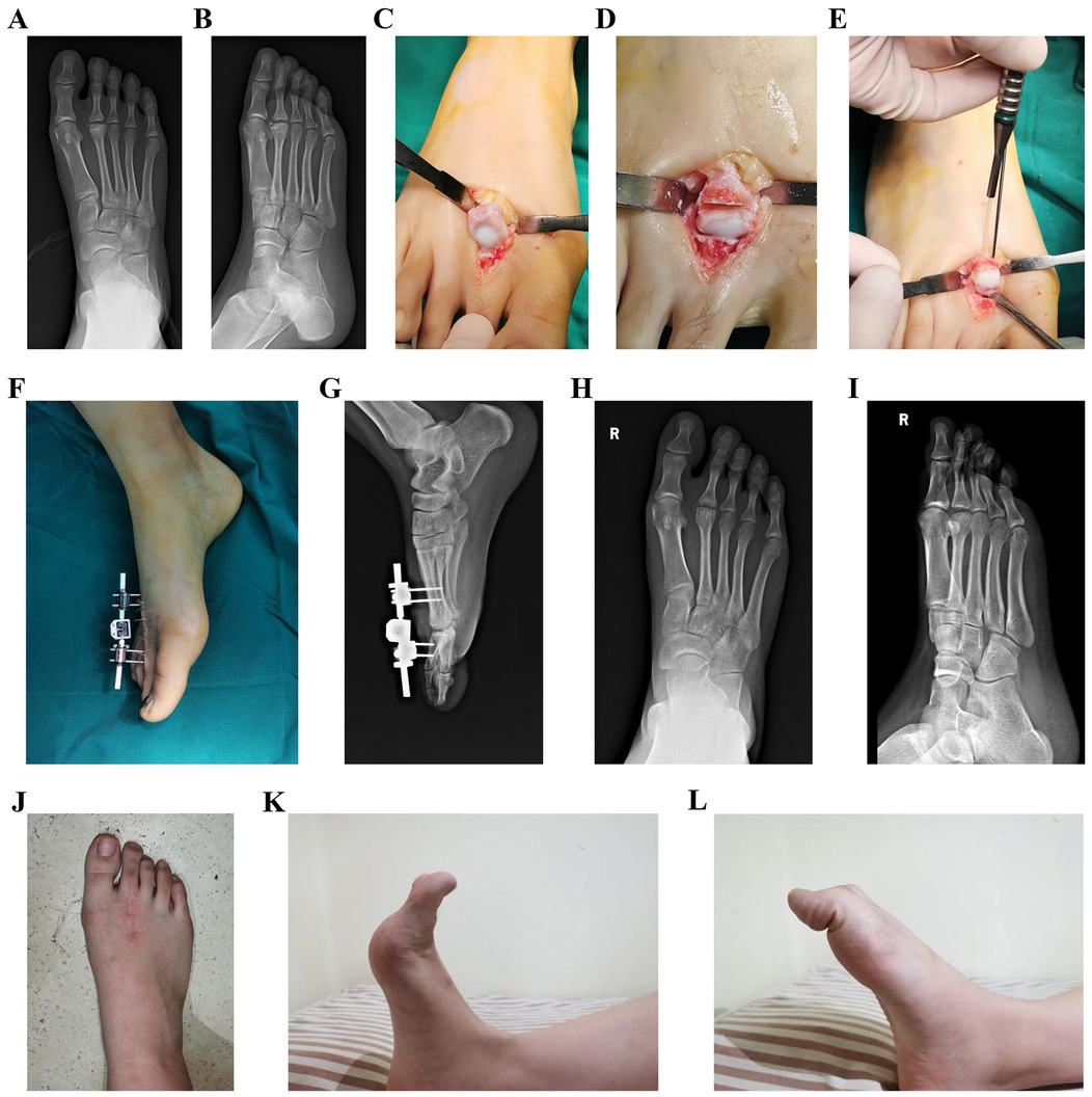 Prophylactic antibiotics were administered for 24 h after the surgery. Special attention was paid to postoperative toe sensory function as part of our routine safety protocol. Neurovascular checks (light-touch/pin-prick sensation, capillary refill, skin temperature) were performed at regular intervals. If any new numbness or paresthesia suggestive of nerve tension had been detected, the distraction would have been immediately reduced by adjusting the external fixator (rather than removing it), and the remaining distraction would have been resumed gradually under inpatient observation.. On the third postoperative day, the central dual ball joint knob of the external fixator was loosened to allow for flexion-extension exercises of the metatarsophalangeal joint without altering the distraction length. Two weeks after the surgery, patients were allowed to bear weight while walking with a forefoot offloading shoe. The pin sites were kept clean and dry, with regular antiseptic dressing changes. Follow-up visits were conducted in the outpatient clinic at 4, 8, and 12 weeks, 6 months, and 1 year postoperatively, and at the final follow-up, during which foot x-rays were taken. The external fixator was removed in the outpatient clinic 6 weeks after the surgery. Based on bone healing, a gradual transition to full weight-bearing with normal shoes was initiated between 8 and 12 weeks after the surgery.