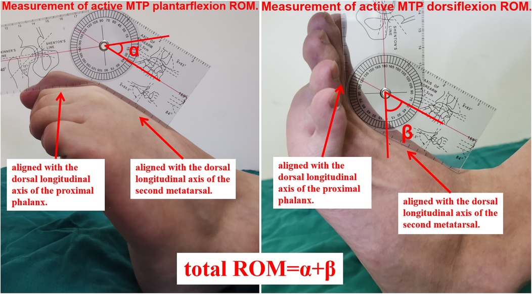 Figure 4. Measurement of metatarsophalangeal joint range of motion (ROM). With the patient supine or seated and the foot and ankle in neutral alignment, the goniometer fulcrum was positioned over the dorsal center of the second MTP joint. The proximal arm of the goniometer was aligned with the dorsal longitudinal axis of the second metatarsal, and the distal arm with that of the proximal phalanx. Patients were then instructed to actively move to end-range plantarflexion (α) and dorsiflexion (β), at which points the angles were recorded. Total ROM = α + β.