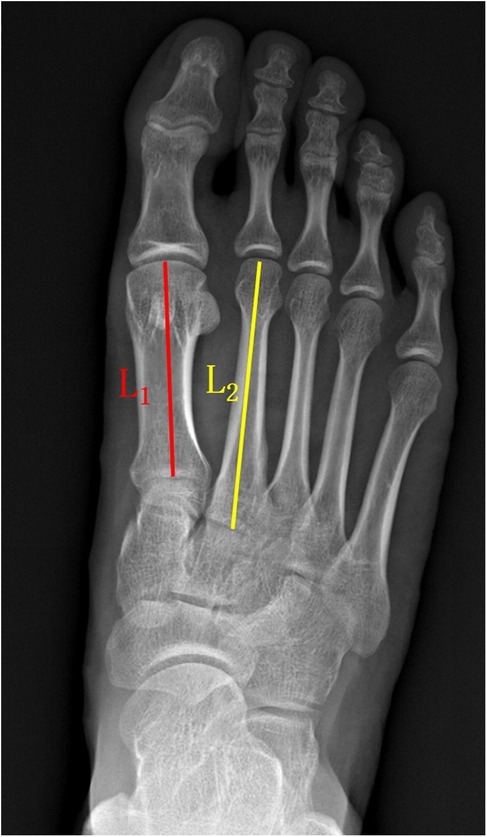 VAS (a numerical scale with a range from 0 to 10, where 0 represented “no pain” and 10 indicated “worst possible pain.”) and AOFAS-LMI scores were used to assess toe pain and function preoperatively and at 6 months postoperative, 1 year postoperative, and the final follow-up. The ROM of the metatarsophalangeal joint, including dorsiflexion and plantarflexion, was measured, and the total ROM was calculated. We measured active sagittal-plane range of motion (dorsiflexion and plantarflexion) of the second metatarsophalangeal (MTP) joint using a flexible, MTP-specific goniometer. With the patient supine or seated and the foot and ankle in neutral, the goniometer fulcrum was placed over the dorsal center of the second MTP joint. The proximal arm was aligned with the longitudinal axis of the second metatarsal, and the distal arm with the proximal phalanx. Patients were then instructed to actively move to end-range dorsiflexion and plantarflexion, at which point the angle was recorded (Figure 4). Metatarsal shortening was measured on weight-bearing anteroposterior x-rays of the foot using the following method. The preoperative length of the first metatarsal (L1 pre) and the second metatarsal (L2 pre) were measured using the first metatarsal length as a reference. At the final follow-up, the lengths of the first metatarsal (L1 post) and second metatarsal (L2 post) were measured, and the change in length (L0) was calculated as follows: L0 = L2 post/(L1 post/L1 pre) - L2 pre (Figure 5). Related complications (non-union, osteomyelitis, necrosis of the metatarsal head, or progression of metatarsophalangeal joint arthritis) were recorded.