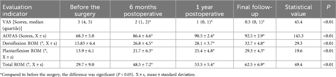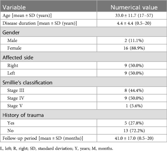 In total, there were 9 patients with left side disease and 9 patients with right side disease. Of them, 16 (88.9%) were females and 2 (11.1%) were males. Based on Smillie's classification (10), 8 patients were classified as stage III, 9 patients as stage IV, and 1 patient as stage V. Patients' ages ranged from 17 to 57 years (33.0 ± 11.7), and their disease duration ranged from 0.5 to 20 years (4.4 ± 4.4 years). Five patients (27.8%) had a history of trauma (all mild trauma, including 2 sprains or strains of the foot, 1 contusion, 2 minor falls or twists), while the remaining patients had no clear history of trauma or were unable to recall any prior traumatic events. No patient experienced postoperative toe numbness, dysesthesia, or ischemic changes, and no early reduction of distraction or unplanned adjustment was required. The follow-up period ranged from 18 to 72 months, with an average of 41.0 ± 17.0 months (Table 1). Compared to preoperative values, there were significant improvements in VAS and AOFAS-LMI scores at the final follow-up (P < 0.05). Additionally, dorsiflexion, plantarflexion, and total ROM of the metatarsophalangeal joint significantly improved compared to preoperative measurements (P < 0.05) (Table 2). There were no cases of neurovascular injury, transfer metatarsalgia, implant rejection, or irritation. One patient (5.6%) underwent wound drainage and peripheral redness at the pin site three weeks after the surgery, which resolved after removing the external fixator and wound care. No other pin-site infections, deep infection or osteomyelitis were noted.