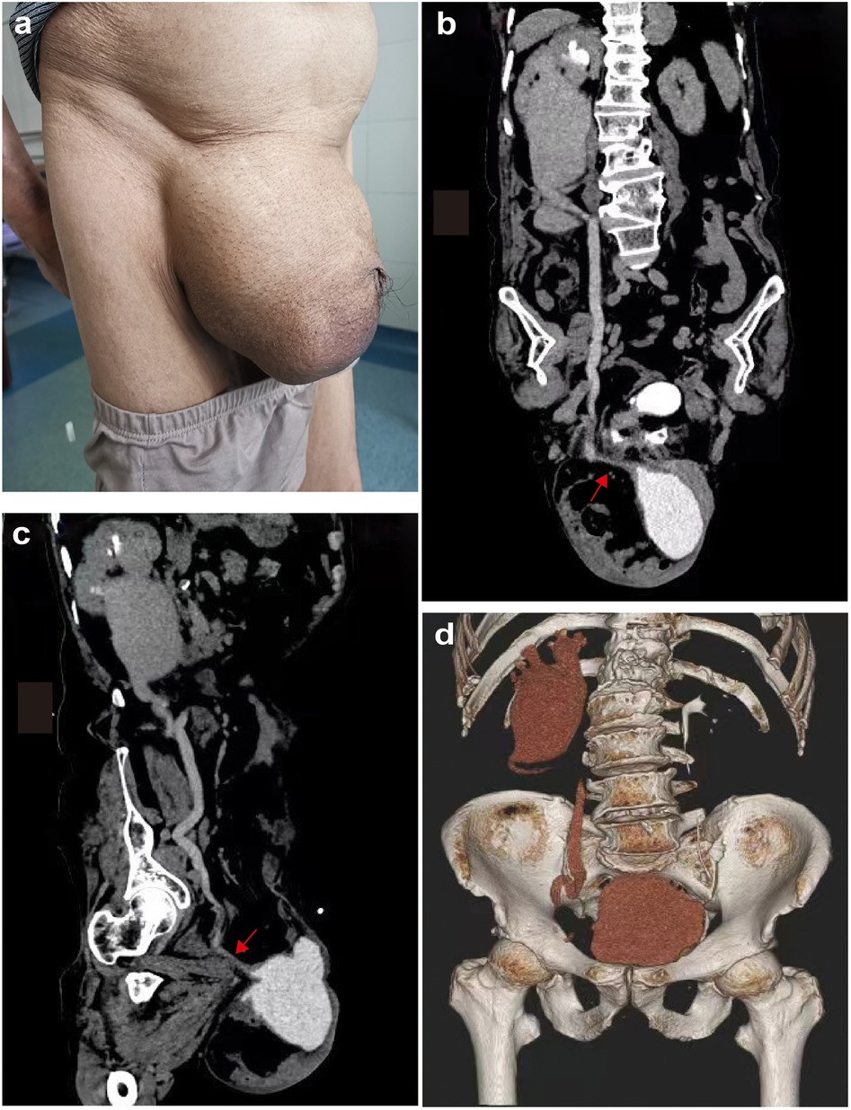 Figure 1. (a) Preoperative appearance of the right inguinal region (b,c) preoperative and postoperative CT urography (CTU) of the patient. CTU demonstrates a right inguinal hernia, intestinal and omentum hernia, bladder, and distal ureteral hernia, dilated right ureter, and severe right hydronephrosis. The red arrow marks the herniated right distal ureter. (d) The CTU was repeated 7 days after surgery, and the bladder and right ureter were repositioned.