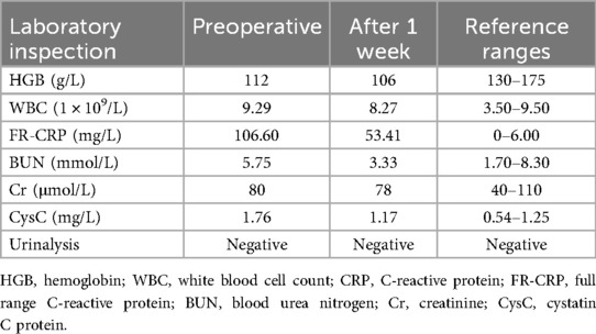 Preoperative and postoperative laboratory results are shown in Table 1. Preoperative color ultrasound showed a right inguinal hernia, severe right hydronephrosis, and prostatic hyperplasia. CTU demonstrated right inguinal hernia, herniation of the intestine, omentum, most of the bladder, and distal ureter, right ureter dilation, and severe right hydronephrosis, as shown in Figures 1b,c. The CTU did not reveal any evidence of radiopaque mesh material from previous repairs. Following the CTU findings, a targeted history was retaken. The patient then described a two-stage pattern of urination: an initial normal stream, followed by a need to manually compress the scrotal mass to complete voiding, after which the mass would noticeably reduce in size.