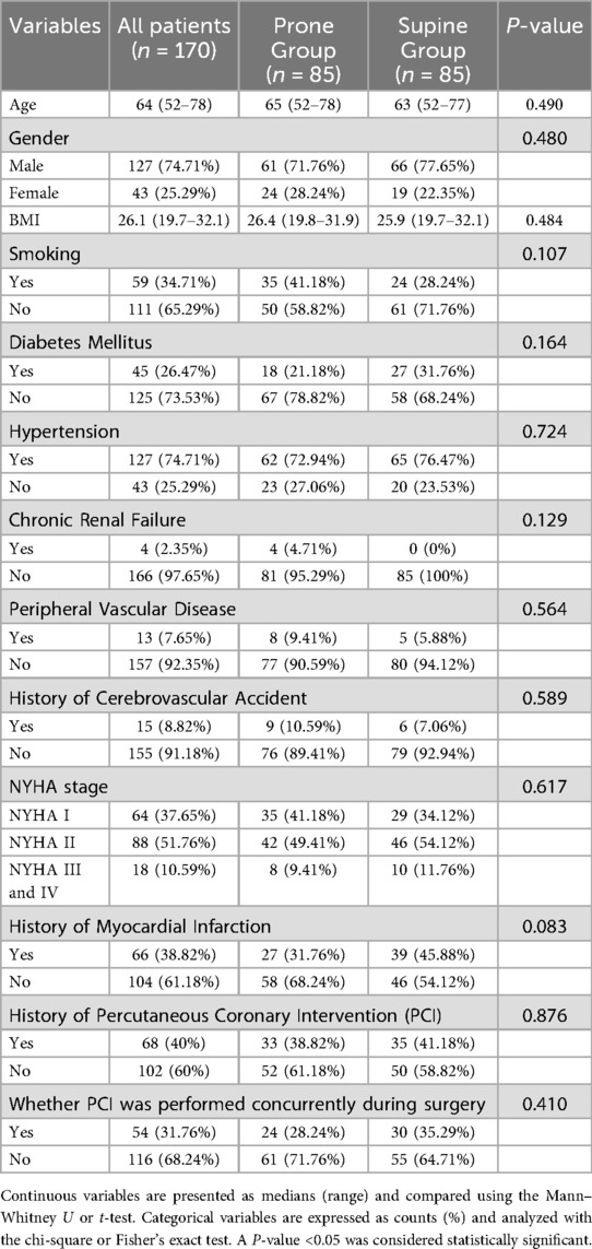 Overall, these characteristics showed no significant differences between the prone and supine groups, indicating good baseline balance and comparability (Table 1).
