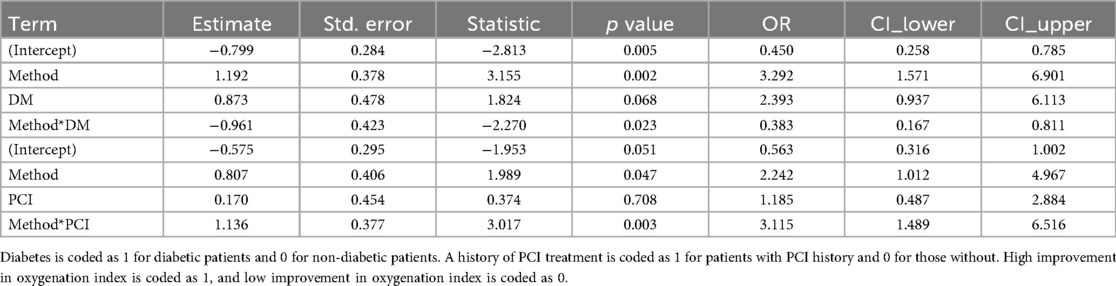 The above multivariate linear regression analysis indicated that diabetes mellitus and a history of PCI also had significant impacts on the degree of improvement in the oxygenation index; they may act as effect modifiers or important confounders. Therefore, we further performed stratified analyses by diabetes status and PCI history to explore the effects of different recruitment maneuvers on oxygenation improvement within these subgroups. The results showed that in the non-diabetic group, the proportion of patients with significant oxygenation improvement was markedly higher in the prone group compared to the supine group, while no significant difference was observed in the diabetic group (Figures 2A,B). In both the non-PCI and PCI history groups, the prone group exhibited a significantly higher proportion of oxygenation improvement than the supine group, with a stronger significance observed in the PCI history group (Figures 2C,D). The interaction analysis in the multivariate regression model also shows that the interaction term between the recruitment method and diabetes has an OR of 0.383 (95% CI: 0.167–0.811). The interaction term between the recruitment method and prior PCI has an OR of 3.115 (95% CI: 1.489–6.516) (Table 5). This suggests that in non-diabetic patients and those with prior PCI, the prone recruitment strategy is more strongly associated with improvement in the oxygenation index. However, these analyses are preliminary and exploratory, and further validation and confirmation are needed.
