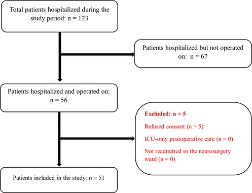 • Received postoperative care in the neurosurgery ward (excluding those cared for exclusively in the ICU).