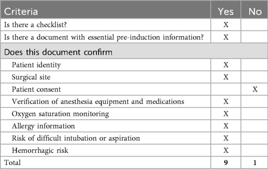 Each procedure—before anesthesia induction, before skin incision, and before the patient leaves the operating room—as well as inpatient procedures, was evaluated using a checklist. Each checklist item was assessed independently. For each evaluation step, the interviewer would mark “YES” or “NO” accordingly. The denominator was the total number of items per category.