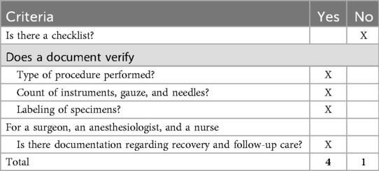 Among the 37 checklist items assessed across operating room and ward procedures, 24 items (64.9%) were found to be compliant with established protocols (Tables 1–5).