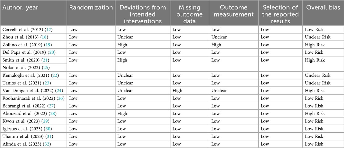 In reference to the randomization domain, all included studies had a low risk of bias in that area (17–32). Assessing the deviation from the intended interventions domain, 4 studies had a high risk of bias (19, 21, 25, 28), and 4 studies had an unclear risk (18, 22–24). Concerning missing outcome data, only one study exhibited a high risk of bias (24). In the domain of outcome measurement, 2 studies had some concerns in that area (18, 24), while one study (19), was classified as having a high risk of bias.