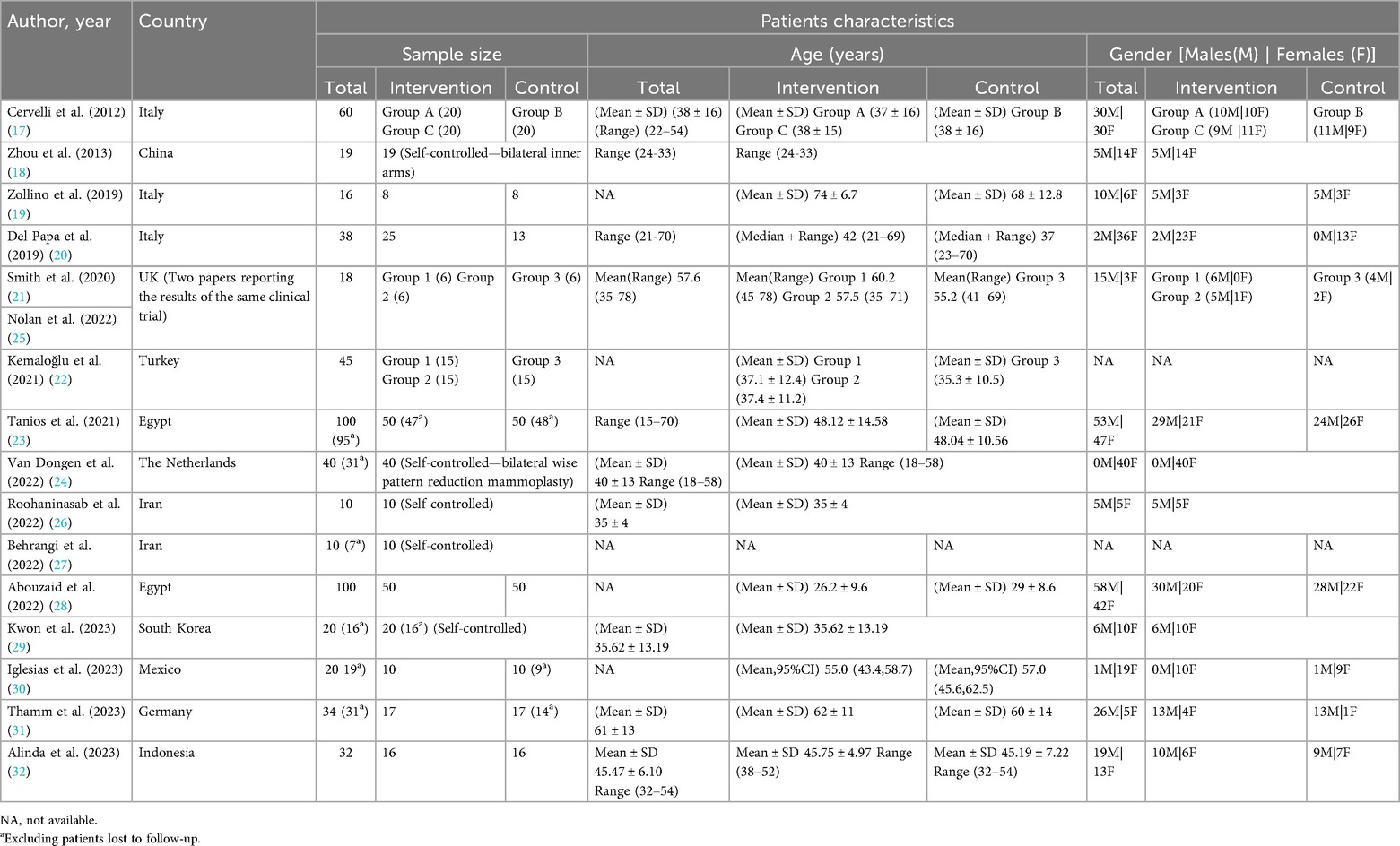 Table 3 provides an overview of the demographic characteristics of patients across all clinical trials. Our review included 537 patients, excluding those lost to follow-up, with an age range spanning from 15 to 78 years. The studies included a wide variety of wound and ulcer types: six studies focused on the effects of adipose tissue treatments on chronic lower leg ulcers (19, 21, 23, 25, 31, 32), while four examined post-surgical and traumatic scars (17, 22, 24, 29), including two that specifically addressed post-reduction mammoplasty scars (22, 24). Additionally, two trials explored treatments for acne scars (26, 27), and one study delved into the role of adipose tissue and its derivatives in post-laser resurfacing scars (18). Furthermore, two clinical trials centered on patients with ischemic digital ulcers due to systemic sclerosis (20, 30), and one trial focused on patients with superficial and deep dermal burn wounds (28).
