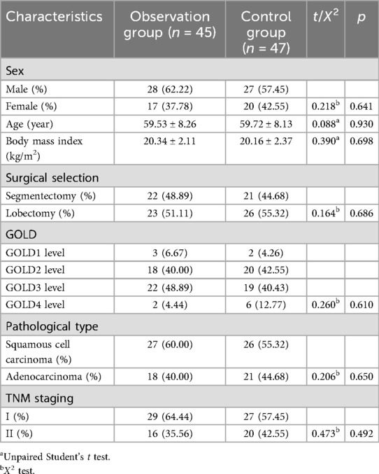 The clinical data of 92 patients who diagnosed with COPD complicated with lung cancer at our hospital between February 2023 and March 2024 were analyzed, adopting the method of block randomization. All patients were diagnosed with lung cancer through preoperative biopsy, and moderate to severe COPD was defined when the FEV1/FVC < 70%, −2.51 < Z-value <−4.00 is moderate, and Z-value < −4.10 is severe. there were no statistically significant differences between the two groups in terms of gender, age, body mass index, surgical selection, pathological type, and TNM staging (p > 0.05), as shown in Table 1. This study was approved via the Ethics Committee of our hospital.