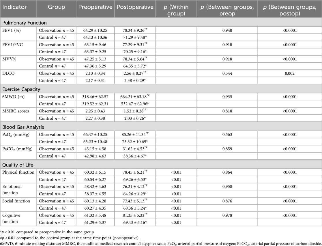 Results: After intervention, the observation group showed significantly higher levels of FEV1, FEV1/FVC, MVV%, DLCO, and 6MWD compared with the control group, while the MMRC score was significantly lower (all p < 0.05). Regarding blood gas indicators, the observation group had a significantly higher PaO2 level and a significantly lower PaCO2 level than the control group (p < 0.05). Additionally, the quality of life score in the observation group was significantly higher, and the postoperative complication rate was significantly lower than those in the control group (both p < 0.05).