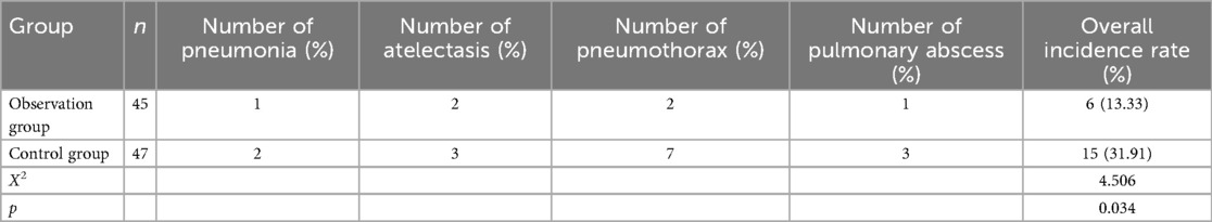 After intervention, The incidence of complications in the observation group (13.33%) was lower than that in the control group (31.91%, p < 0.05), as shown in Table 3.