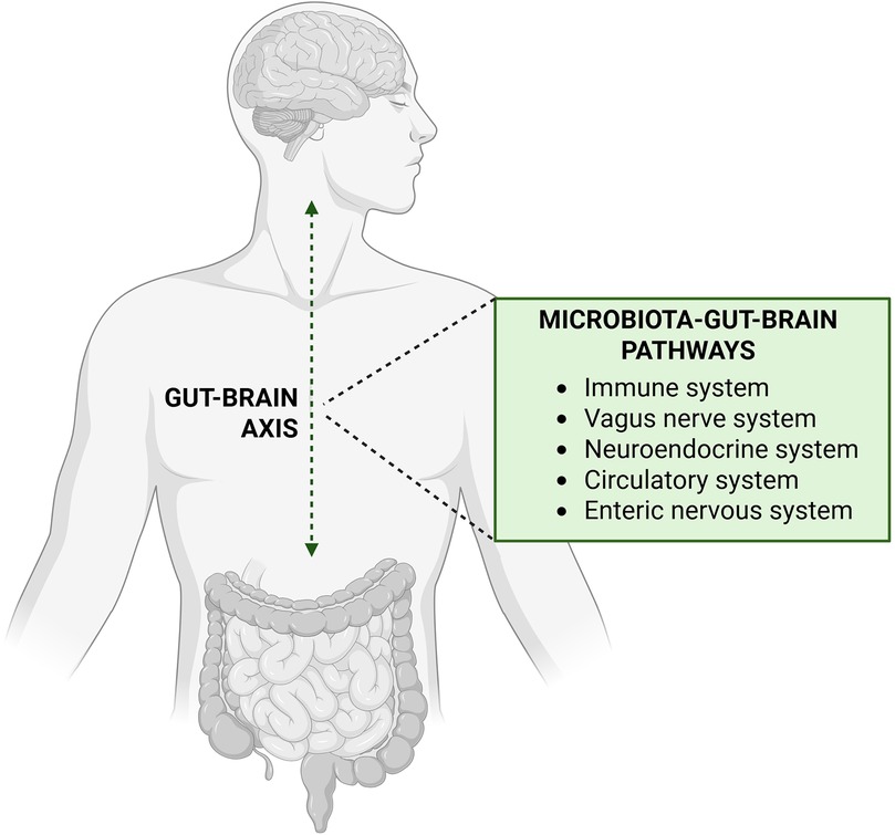 The human microbiome, particularly the gut microbiome, plays a pivotal role in maintaining physiological homeostasis, serving as a critical interface between the external environment and the host's metabolic and immune systems (19–21). The gut microbiota assists in digesting food that the stomach and small intestine have not fully processed, extracting nutrients and energy that are essential for human health. Additionally, it synthesises key nutrients and metabolites, such as short-chain fatty acids (SCFA), which provide energy to host cells and regulate immune responses. Recent research highlighted how these microbial products can influence metabolic health, including impacts on obesity, type 2 diabetes, and other metabolic disorders (3, 22). Moreover, the gut microbiome plays an essential role in the development and maintenance of the mucosal barrier, protecting against pathogens and maintaining immune tolerance to beneficial commensal bacteria (23). The influence of the microbiome extends beyond metabolism and immunity to affect neurobehavioral patterns, with significant implications for mental health and behaviour. The gut-brain axis—a bidirectional communication system between the central nervous system and the gut microbiota—mediates these effects through neural, hormonal, and immunological pathways as shown in Figure 1.