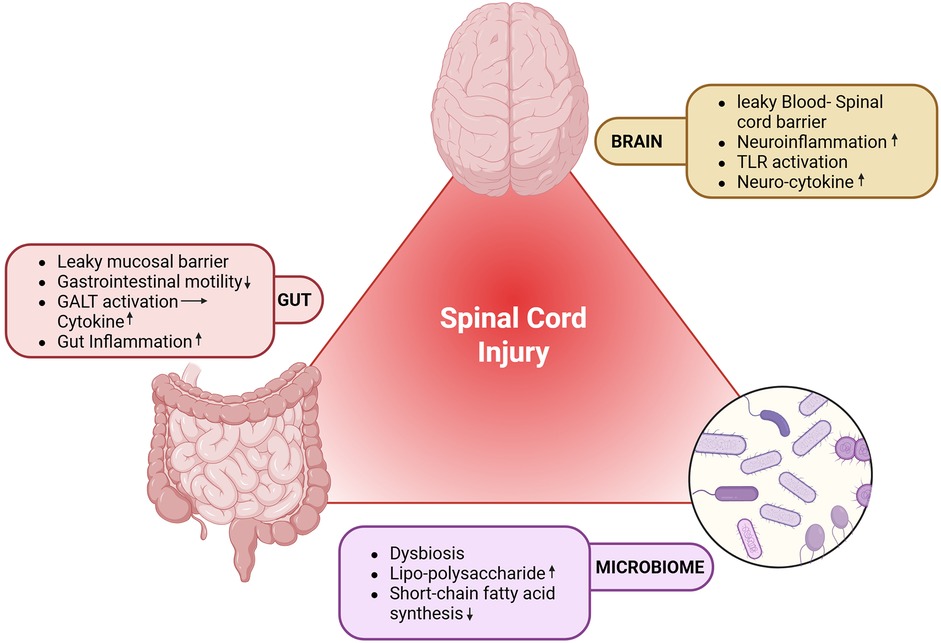 Figure 2. Impact of SCI on the gut microbiome. GALT, gut-associated lymphoid tissue; SCI, spinal cord injury; TLR, toll-like receptor. Created with http://www.BioRender.com.