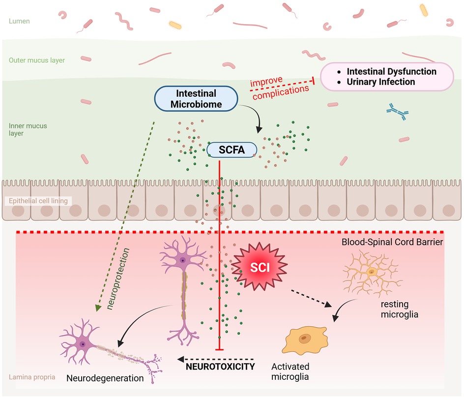 The connections between the gut microbiome and SCI-associated pathologies underscore the potential for microbiome-targeted therapies to mitigate some of the most challenging outcomes of SCIs. By restoring or modifying the gut microbiota, it may be possible to reduce infection rates, dampen chronic inflammation, and alleviate neuropathic pain, ultimately improving quality of life for individuals with SCIs. These insights into the complex interplay between the gut microbiome and various aspects of health in SCI patients highlight the potential for microbiome-based therapies to address not just local but systemic challenges posed by SCIs. As the field advances, these microbial connections offer promising avenues for comprehensive interventions aimed at improving the overall quality of life for individuals suffering from SCI.
