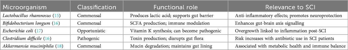 The gut microbiome comprises a complex community of microorganisms, primarily bacteria, along with viruses, fungi, and protozoa, that reside in the human gastrointestinal tract. This ecosystem is predominantly colonised by bacteria from the phyla Firmicutes and Bacteroidetes, although significant diversity exists both across and within individual humans (12, 13). The composition of this microbiota is influenced by a myriad of factors, including genetics, age, diet, lifestyle, and antibiotic use. This dynamic community plays a crucial role in the digestion of food, synthesis of vitamins (such as vitamin K and some B vitamins), and the metabolism of bile acids and other substances that are essential for maintaining health (14). In the context of SCI, disruptions in gut microbial balance can influence systemic inflammation and recovery outcomes. Table 1 summarises key gut microorganisms and their specific contributions to host physiology.