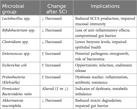 Patients with SCI are frequently exposed to broad-spectrum antibiotics during acute hospitalization and rehabilitation, primarily for managing urinary tract infections, pneumonia, and pressure ulcers (43). While these interventions are clinically warranted, they inadvertently disrupt gut microbial homeostasis (44, 45). Antibiotic-induced dysbiosis leads to a marked reduction in beneficial commensals such as Lactobacillus and Bifidobacterium, impairing mucosal immunity and short-chain fatty acid production (17, 46). Concurrently, opportunistic pathogens like Enterococcus faecalis, Klebsiella pneumoniae, and Clostridioides difficile may proliferate, increasing the risk of systemic infections and inflammation (47). The hospital environment further exacerbates this imbalance through nosocomial microbial exposure, limited dietary fiber intake, psychological stress, and reduced mobility thereby all of which impair gut motility and barrier integrity. These factors collectively delay microbial recovery and contribute to persistent dysbiosis in SCI patients, even months post-discharge (45, 47). Recognizing these vulnerabilities underscores the need for microbiome-preserving strategies, including antibiotic stewardship, early probiotic supplementation, and dietary interventions tailored to restore microbial diversity (48). Future research should explore longitudinal microbiome dynamics in SCI cohorts and evaluate targeted therapies that mitigate hospital-acquired dysbiosis while enhancing neuroimmune resilience.
