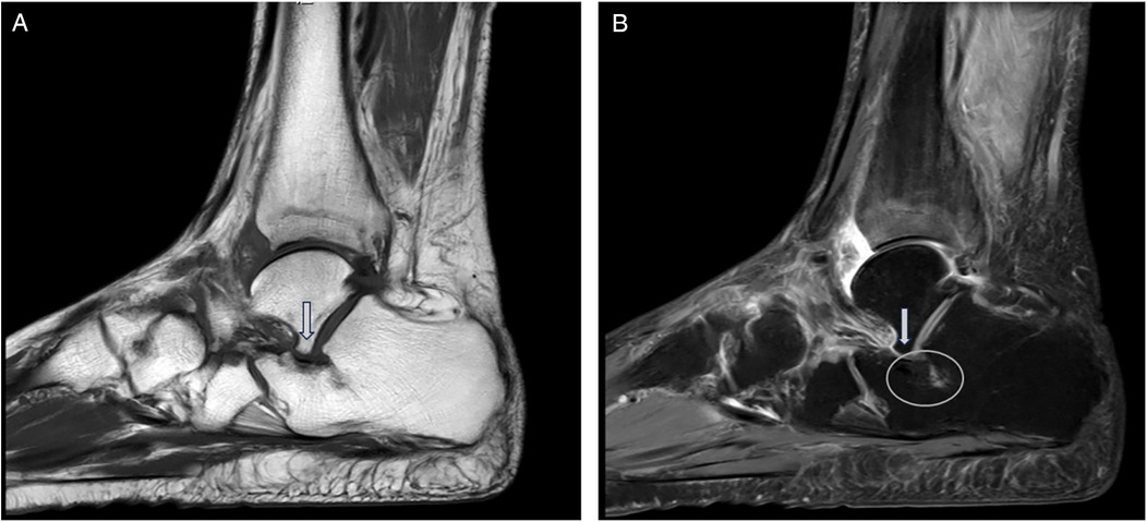 Figure 1. AALTF is anatomically identified as a bony protuberance arising from the lateral talar process and extending anteriorly to articulate with the calcaneus. (A) It is typically observed on sagittal T1-weighted MRI as a discrete osseous structure that contributes to talocalcaneal impingement in patients with flatfoot deformities (arrow). (B) Sagittal MRI (T2) imaging proving the presence of an osseous protuberance and the bone marrow edema located at the opposing calcaneal side of the AALTF (circle).