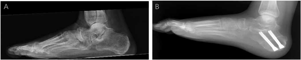 Figure 2. Weight-bearing lateral x-rays of the foot before and after ankle surgery. (A) Preoperative weight-bearing lateral x-ray of the foot: the preoperative lateral view shows significant impingement between the talus and the accessory anterolateral talar facet (AALTF), with abnormal alignment. (B) Postoperative image showing improved alignment and elimination of impingement after AALTF resection and flatfoot correction surgery.