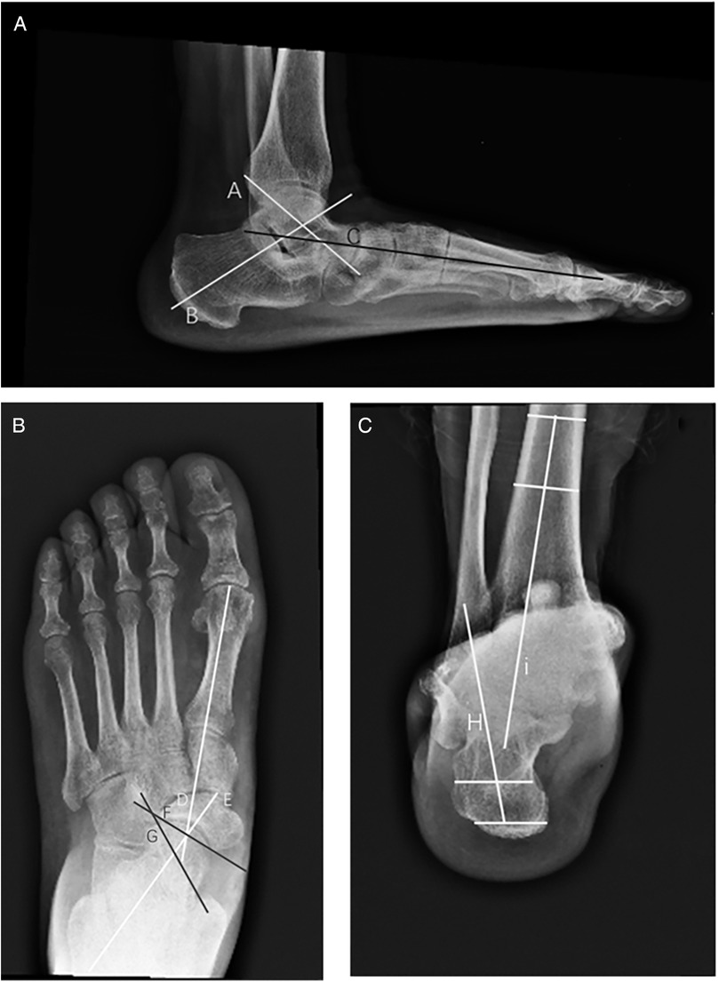 Figure 3. Diagram of various angles in adults with acquired flatfoot deformity. (A) Lateral view: anteroposterior talocalcaneal angle (kite angle)—the angle between the central axes of the calcaneus and talus (A, B); lateral talus-first metatarsal angle (Meary angle)—the angle between the central axis of the talus and the central axis of the first metatarsal (A–C). (B) Anteroposterior view: anteroposterior talus-first metatarsal angle (TM1)—the angle between the central axis of the first metatarsal and the central axis of the talus (D, E); talonavicular coverage angle (TNCA)—the angle formed by the central axis of the talus and the edge line of the navicular joint surface (F, G). (C) Hindfoot coronal alignment views: Saltzman's view hindfoot moment arm (HMA)—the distance between the two points (H, I) is HMA.
