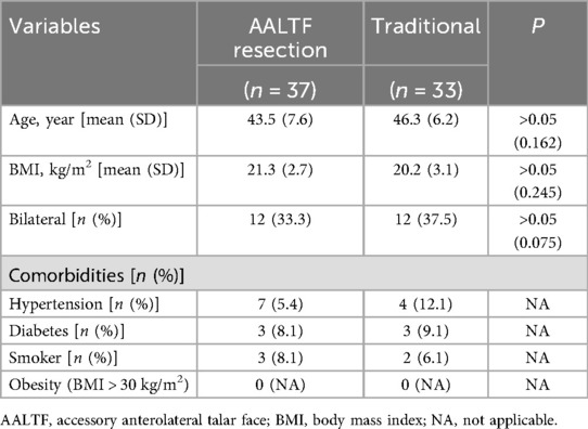 Patients were divided into two groups based on differences in their treatment plans from previous surgical records, with grouping decisions guided by a preoperatively standardized objective assessment system: the AALTF resection group (AALTF resection along with concomitant flatfoot procedures; 19 men and 18 women) and the traditional group (only flatfoot procedures were performed; 17 men and 16 women). The standardized grouping criteria were based on three core objective indicators: (1) MRI-based assessment: AALTF size (defined as “significant AALTF” when the maximum diameter was >3 mm) and the degree of surrounding bone marrow edema (classified as mild, moderate, or severe based on T2-weighted MRI; patients with moderate-to-severe edema were included in the resection group); (2) physical examination: visual analog scale (VAS) score for sinus tarsi tenderness ≥4 points and exacerbated pain during passive hindfoot eversion; and (3) hindfoot deformity stiffness: positive Silverskiold test and subtalar joint range of motion (ROM)<10°. All preoperative assessments were independently completed by two senior orthopedic surgeons (each with ≥10 years of experience in foot and ankle surgery). In case of inconsistent opinions, a consensus was reached through departmental case discussions. The grouping method was further verified by reviewing surgical records and preoperative imaging data to ensure the objectivity and consistency of the grouping criteria. At the last follow-up, all associated data were analyzed by two additional senior surgeons who were blinded to the initial grouping criteria to avoid analytical bias. For each patient, the final radiographic result was the average of the measurements of the two surgeons. We excluded patients who responded satisfactorily to conservative treatment, as well as those with ankle osteoarthritis, severe angioneuropathy, soft-tissue infection at the surgical site, or a history of mental illness. All participants provided written informed consent, and the study was approved by the Ethics Committee of our institution.