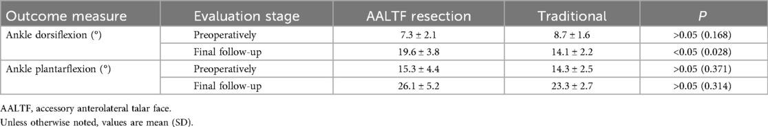 Ankle dorsiflexion improved significantly after surgery in the AALTF resection group, whereas no significant change was observed in the traditional group. Plantarflexion ROM was comparable between the two groups (P = 0.77), while dorsiflexion ROM was greater in the AALTF resection group (P = 0.032) at the final follow-up (Table 2).