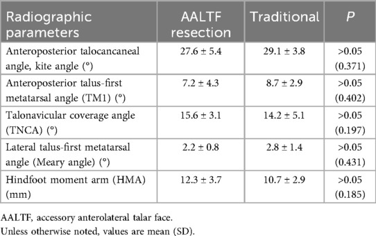 Review of the radiographic parameters demonstrated that patients who underwent AALTF resection demonstrated similar postoperative radiographic changes with regard to anteroposterior talocancaneal angle (kite angle), anteroposterior TM1, TNCA, Saltzmans' view HMA, and lateral talus-first metatarsal angle (Meary angle) compared with the traditional group (P > 0.05; Table 3).