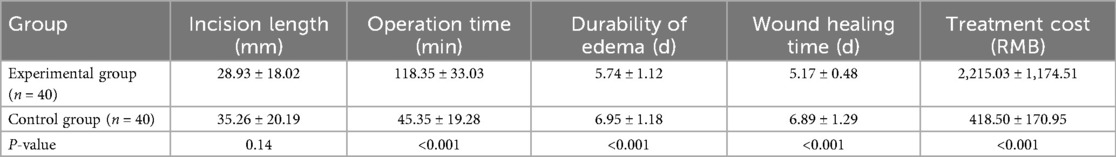 Perioperative indicators: The length of surgical incision, operation time, duration of postoperative edema, wound healing time, and treatment costs of the two groups of patients were recorded, and the corresponding data were counted and statistically analyzed.