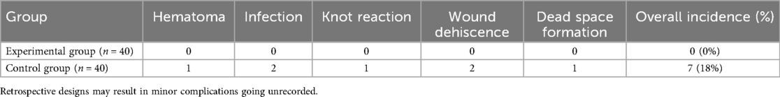 Surgical complications: The occurrence of postoperative complications in both groups of patients, including infection, hematoma, knot reaction, dead space formation and wound dehiscence, was recorded and the incidence was calculated.