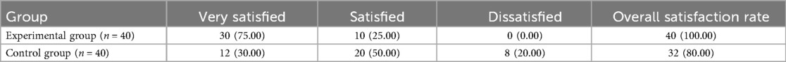 Total satisfaction rate of treatment: After a systematic evaluation of 80 patients using a standard scale, it was found that the total satisfaction rate of the experimental group was 100%, of which 30 patients clearly stated that they were very satisfied with the treatment results, 10 patients agreed that the treatment results were relatively satisfactory, and no patient in the experimental group expressed dissatisfaction. The total satisfaction rate of the control group was 80%, and the chi-square test showed that the incidence of complications in the experimental group was significantly reduced (P < 0.05) (Table 3).