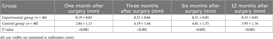Scar width: At 1, 3, 6 and 12 months after surgery, the scar width in the experimental group was significantly smaller than that in the control group (P < 0.05) (Table 4).