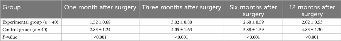 Vancouver Scar Scale (VSS): At 1, 3, 6 and 12 months after surgery, the VSS scores of the experimental group were significantly lower than those of the control group (P < 0.05) (Table 5).