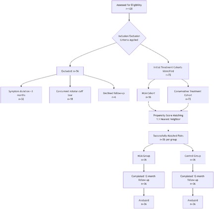 A total of 128 potentially eligible patients were screened, of whom 56 were excluded (32 due to symptom duration <3 months, 18 with concurrent rotator cuff tears, and 6 who declined participation). Ultimately, 72 patients (36 in the MUA group and 36 in the control group) completed the 12-month follow-up, with no dropouts. The study flow is detailed in Figure 1.