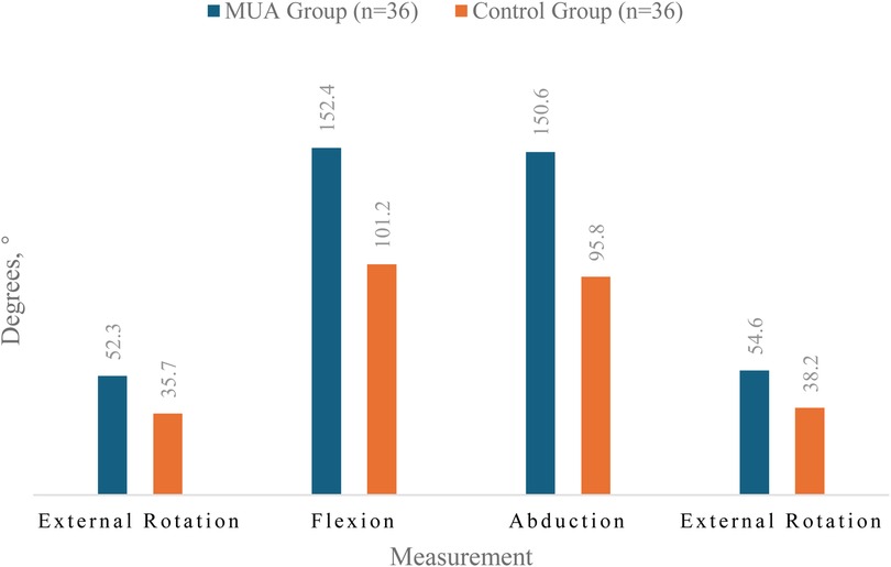 At the 12-month follow-up, the MUA group achieved significantly greater ROM in all planes compared to the control group, as graphically represented in Figure 2.