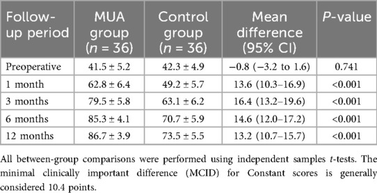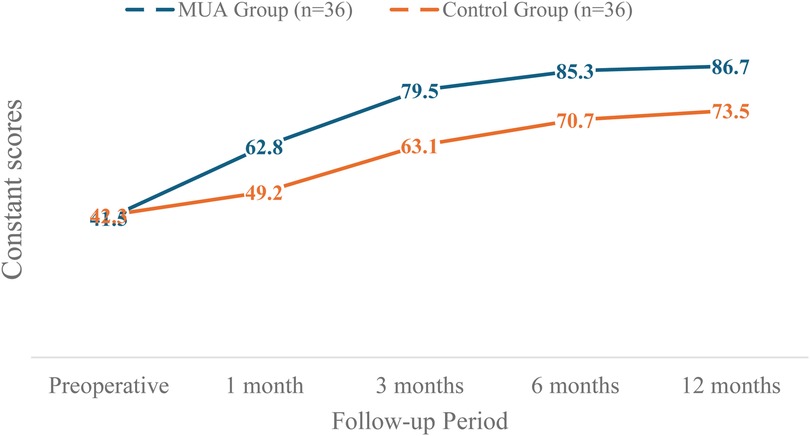 The dynamic changes in Constant scores are visually summarized in Figure 3. The MUA group demonstrated a steeper and greater improvement trajectory compared to the control group throughout the follow-up period.