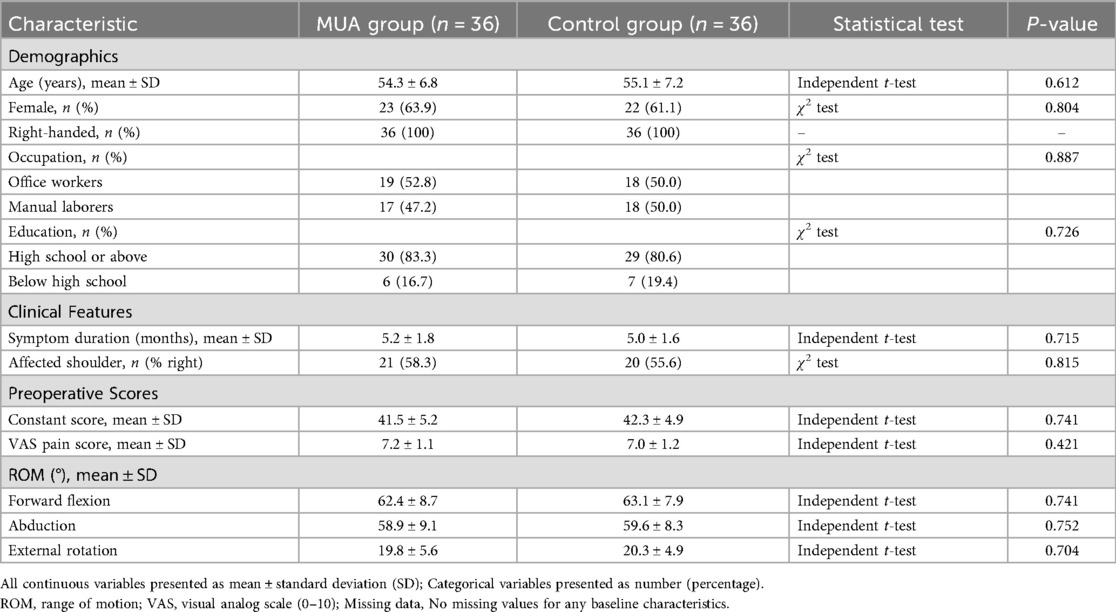 The baseline characteristics were well-balanced between groups (Table 1). The MUA group had a mean age of 54.3 ± 6.8 years, with 63.9% female participants, while the control group had a mean age of 55.1 ± 7.2 years, with 61.1% female participants. Preoperative Constant scores (41.5 ± 5.2 in the MUA group vs. 42.3 ± 4.9 in the control group) and range of motion (ROM) measurements showed no significant differences (P > 0.05). All patients were right-handed, with occupations distributed between office workers (52.8%) and manual laborers (47.2%). In terms of education, 83.3% had completed high school or higher.