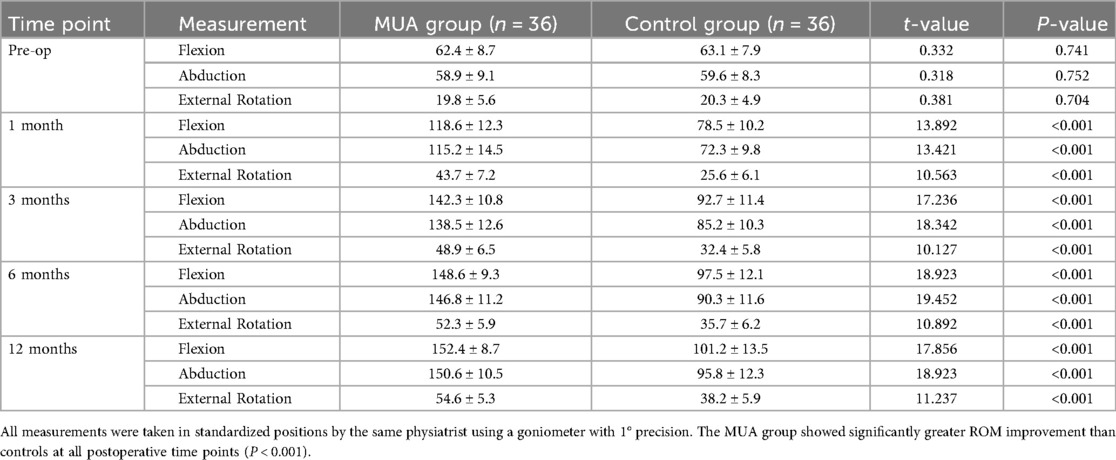 As shown in Table 2, the MUA group demonstrated significantly greater improvement in ROM at 1 month post-intervention. Forward flexion increased from 62.4° ± 8.7° preoperatively to 118.6° ± 12.3° (P < 0.001), representing a 40.1° greater improvement compared to the control group (63.1° ± 7.9° to 78.5° ± 10.2°, 95% CI: 35.2–44.9). This advantage persisted at the 12-month follow-up (MUA group: 152.4° ± 8.7° vs. control group: 101.2° ± 13.5°, P < 0.001). Similar patterns were observed for abduction and external rotation (P < 0.001 at all time points). Notably, 83.3% of MUA patients achieved near-normal ROM (≥90% of the unaffected side) by 3 months, compared to only 36.1% in the control group (P < 0.001).