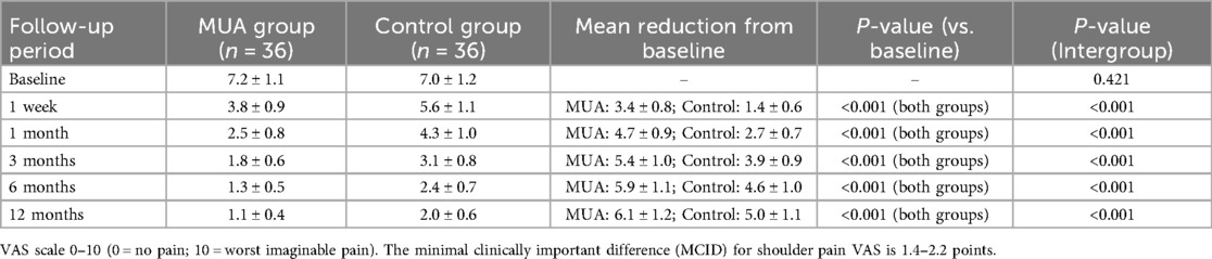 VAS scores (Table 4) indicated faster and more substantial pain relief in the MUA group. At 1 week, pain decreased by 3.4 ± 0.8 points (vs. 1.4 ± 0.6 in controls), and by 1 month, the reduction reached 4.7 ± 0.9 points (vs. 2.7 ± 0.7 in controls), surpassing the MCID threshold (1.4–2.2 points). Regarding safety, transient nerve palsy occurred in 2 MUA patients (5.6%), resolving spontaneously within 4 weeks, while 3 controls (8.3%) reported gastrointestinal discomfort. Sensitivity analyses excluding these cases did not alter the primary outcomes.